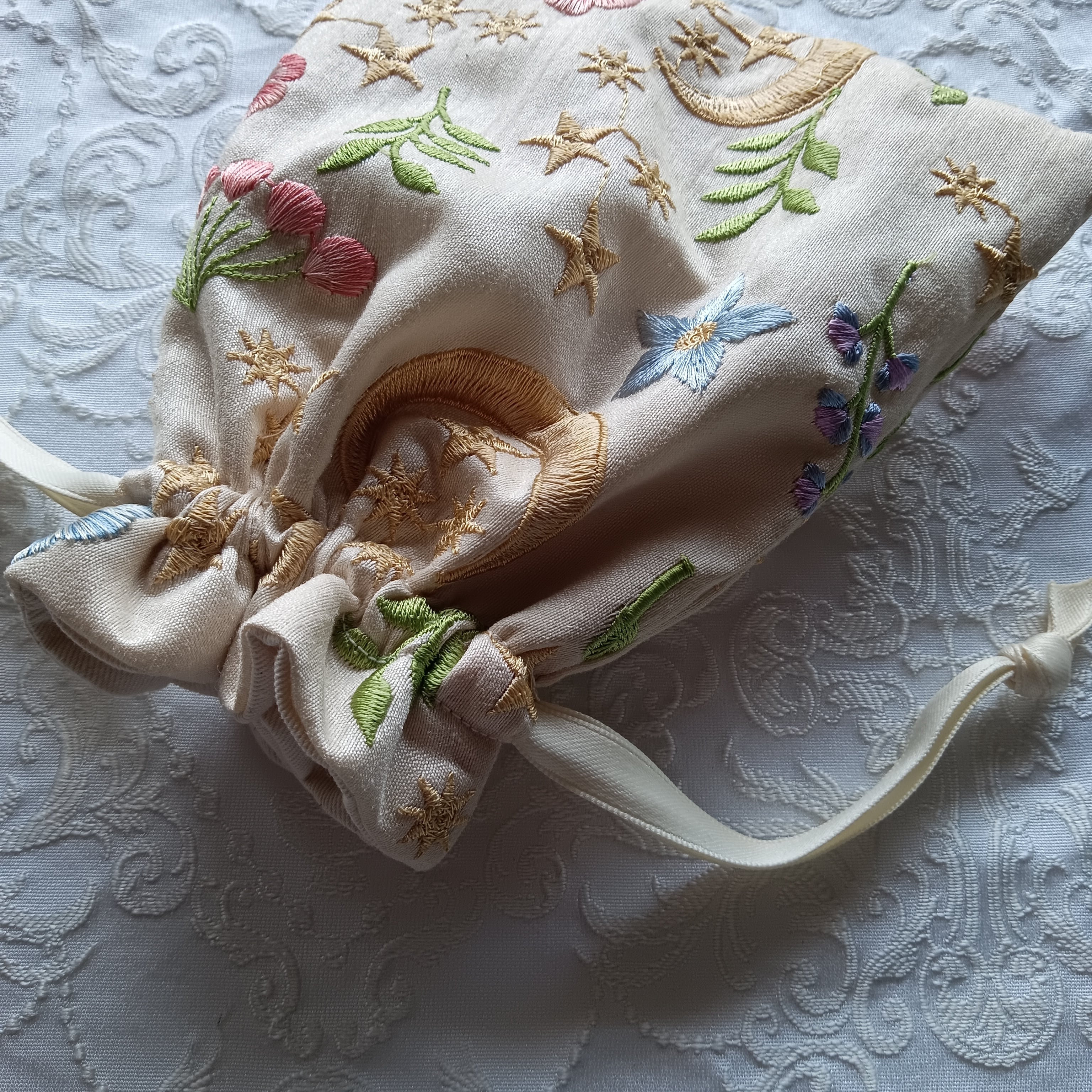 大人気刺繍生地の巾着です★ ちょっとした小物入れに(*^^*) サイズ 横・15cm 縦・18.5cm 紐より下・15cm